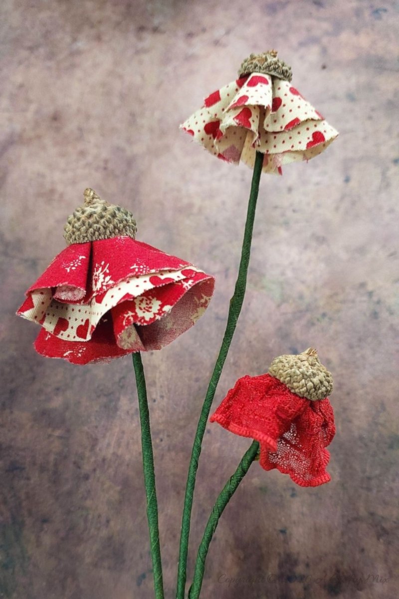 And there’s no sewing involved either. In this beginner‑friendly, cozy tutorial, you’ll learn how to turn a few fabric scraps and real acorn caps into a bunch of long‑lasting flowers you can enjoy all year round.