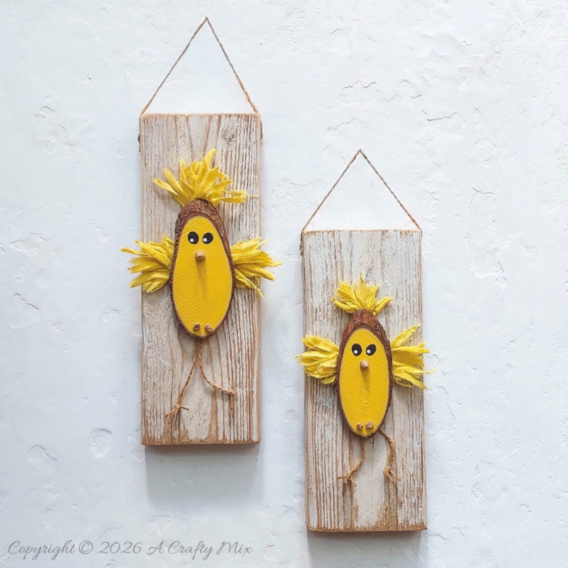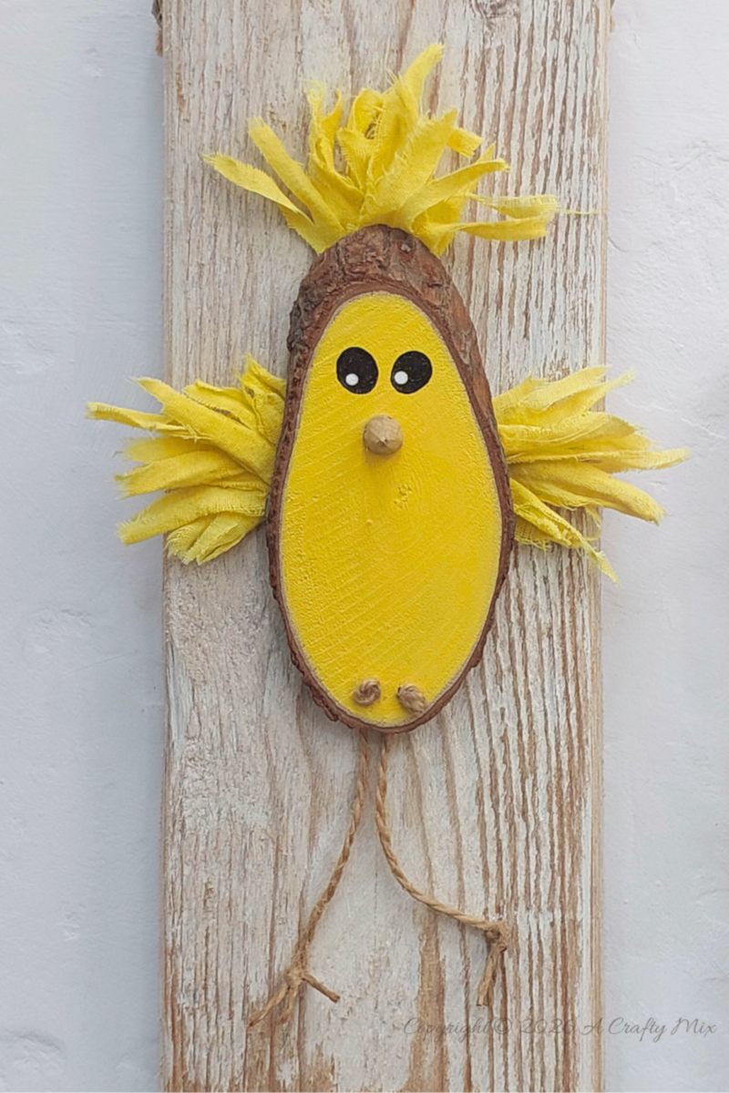 Besides the legs, the wood slice chicks get their quirkiness from their scruffy wings and that feathered, hairdo thing on top of their heads.